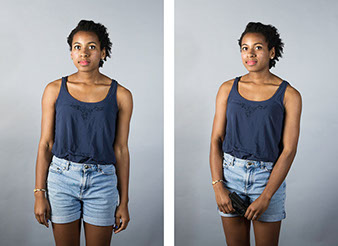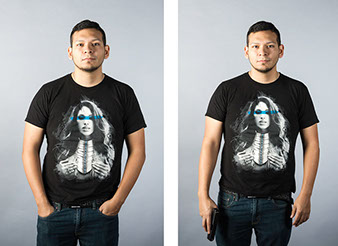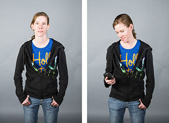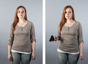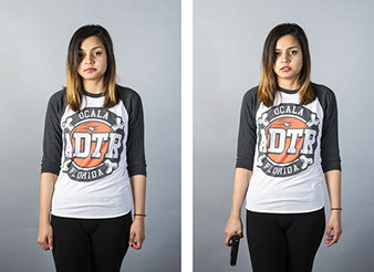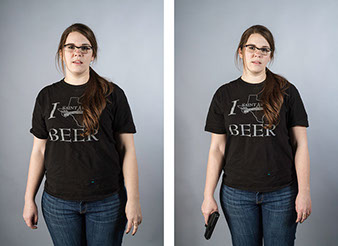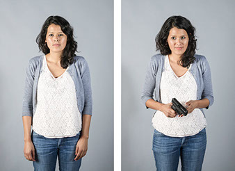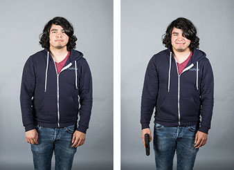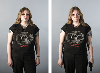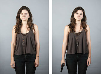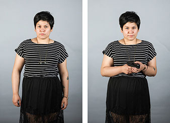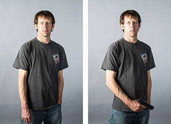 In this series, Armed and ..., the idea is to witness the viewer's and subject's own reaction to a loaded firearm. On the left side of the diptych, the sitter is depicted empty-handed yet knowing they will be given a loaded firearm as a prop for the next exposure. On the right side, the sitter is then photographed holding the gun. All 18 diptychs use a gray seamless backdrop in order to isolate the sitter from any external context. As a result, the viewer and sitter must confront their own prejudices regarding the power of the object being held. For the sitter, we witness how they carry themselves while in possession of a lethal weapon. All the subjects came with different levels of firearms knowledge that range from never seeing a real gun to having extensive training and carry permits. Depending on their understanding, each sitter's mood changed after receiving the gun. The changes shifted from subtle to very pronounced.